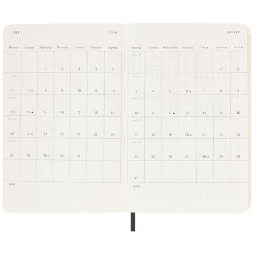 Daté de janvier à décembre 2026, l’agenda hebdomadaire Moleskine de 12 mois à couverture souple et au format poche permet de visualiser la semaine entière en un coup d’œil, tout en offrant des pages d’instantanés annuels et mensuels pour une vue d’ensemble de l’année, suivies de pages pour la planification des voyages, les idées et les objectifs. Les jours de la semaine sont affichés sur un côté, en regard d’une page lignée pour les tâches et les notes. Il est doté d’un papier ivoire sans acide, d’un élastique de fermeture noir, d’un marque-page, d’une pochette intérieure extensible de couleur assortie et d’autocollants pour la personnalisation, ainsi que d’autocollants de l’année pour le dos. Matières : Papier certifié FSC Option d'impression par défaut : Embossage/débossage - Devant - couleurs max : 1 - 45 x 80 mm Pour ce produit, le fournisseur a rempli tout ou partie des données GPSR. Pour plus d'informations, veuillez-vous rapprocher du fournisseur.