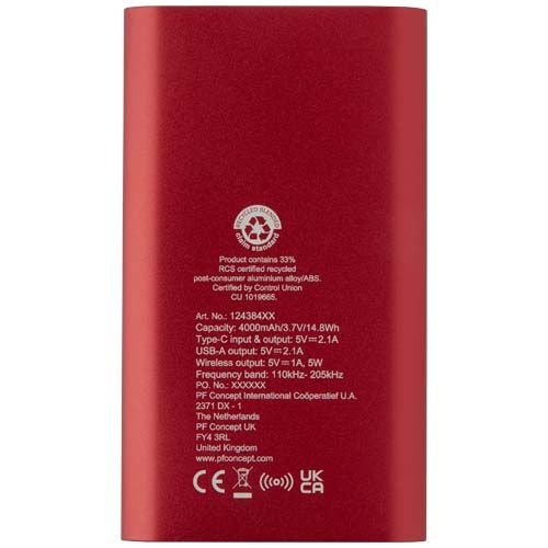 Batterie de secours avec port d'entrée/de sortie de type-C et un port USB-A, permettant de charger deux appareils simultanément. Elle offre également une charge sans fil de 5 W pour tous les appareils compatibles Qi. La batterie de secours est équipée d'une batterie lithium-polymère de 4 000 mAh qui délivre une puissance de sortie totale de 10 W maximum. Cette batterie de secours est fabriquée à 28 % de plastique recyclé certifié RCS. Livrée avec un câble de charge TPE de type-C vers USB-A. Matières : Aluminium recyclé Option d'impression par défaut : Gravure - Devant - couleurs max : 1 - 50 x 25 mm Batterie incluse : 1 C, 71 g. Pour ce produit, le fournisseur a rempli tout ou partie des données GPSR. Pour plus d'informations, veuillez-vous rapprocher du fournisseur.