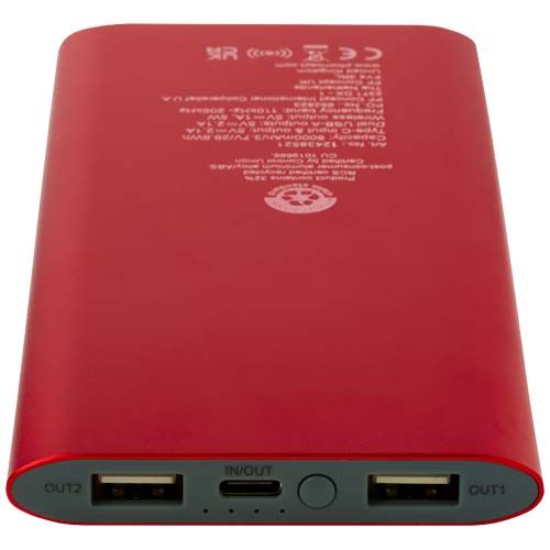 Batterie de secours avec port d'entrée/de sortie de type-C et 2 ports USB-A, permettant de charger 3 appareils simultanément. Elle offre également une charge sans fil de 5 W pour tous les appareils compatibles Qi. La batterie de secours est équipée d'une batterie lithium-polymère de 8 000 mAh qui délivre une puissance de sortie totale de 10 W maximum. Cette batterie de secours est fabriquée à 28 % de plastique recyclé certifié RCS. Livrée avec un câble de charge TPE de type-C vers USB-A. Matières : Aluminium recyclé Option d'impression par défaut : Gravure - Devant - couleurs max : 1 - 50 x 40 mm Batterie incluse : 1 C, Lithium, 134 g. Pour ce produit, le fournisseur a rempli tout ou partie des données GPSR. Pour plus d'informations, veuillez-vous rapprocher du fournisseur.