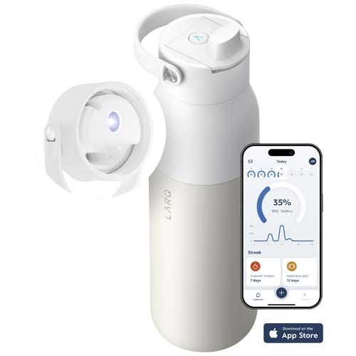 La bouteille d’eau LARQ PureVis™ 2.0 est une bouteille tout-en-un autonettoyante et filtrante de 1 000 ml, avec suivi intelligent de l’hydratation. Elle améliore la qualité de l’eau grâce à un processus de filtration en 2 étapes et de purification UV-C, offrant une eau meilleure et plus propre. La LED UV-C dans le bouchon s’active automatiquement toutes les deux heures pour garder la bouteille propre et sans odeur. Vous pouvez également démarrer manuellement un cycle PureVis™ en appuyant sur un bouton. Dotée d’une batterie longue durée, la bouteille fonctionne jusqu’à 2 à 3 semaines avec une charge complète via le port USB-C. Le bouchon est doté d’une poignée intégrée et détachable pour un transport aisé. Des capteurs intelligents suivent automatiquement votre consommation d’eau, tandis que l’application LARQ fournit des informations et renseigne sur les progrès. Les filtres doivent être remplacés régulièrement pour des performances optimales. Matières : Acier inoxydable Option d'impression par défaut : Tampographie - A l'arrière - couleurs max : 4 - 30 x 70 mm Batterie incluse : Pour ce produit, le fournisseur a rempli tout ou partie des données GPSR. Pour plus d'informations, veuillez-vous rapprocher du fournisseur.