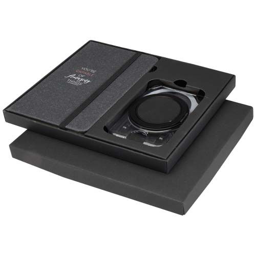 Coffret pratique comprenant un carnet de notes A6 et un porte-cartes MagSafe. Le carnet est doté d’une couverture en plastique recyclé gris foncé, 80 feuilles lignées de couleur crème en papier 70 g/m², et une fermeture élastique noire. Le porte-cartes MagSafe transparent peut contenir une carte et se fixe magnétiquement à l’iPhone 12 ou aux modèles plus récents, et est également livré avec un anneau métallique supplémentaire pour une utilisation avec d’autres téléphones. Les deux articles sont livrés dans un élégant coffret cadeau en carton noir. Matières : Papier certifié FSC® Option d'impression par défaut : Tampographie - Devant - couleurs max : 1 - 30 x 70 mm Pour ce produit, le fournisseur a rempli tout ou partie des données GPSR. Pour plus d'informations, veuillez-vous rapprocher du fournisseur.
