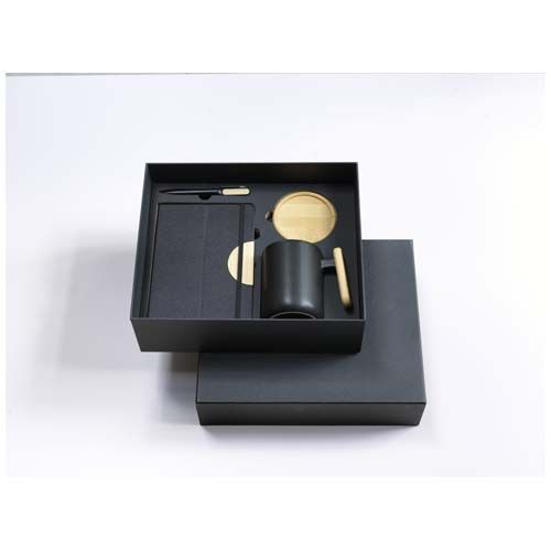 Le coffret cadeau Laura comprend un carnet A5 à couverture rigide en rPET, un stylo bille, un mug en céramique et un sous-verre. Le carnet est doté d'un élastique de fermeture noir, d'un ruban marque-page et de 80 feuilles lignées de couleur crème en papier 80 g/m². La couverture du carnet et le demi-cercle en bambou servent de socle de téléphone. Le stylo bille est fabriqué en aluminium recyclé certifié RCS et présente un revêtement noir, ainsi que des accessoires en bambou sur les deux côtés du corps supérieur. Encre du stylo : Noire. Longueur d’écriture : 400 mètres. Le mug en céramique de 480 ml est accompagné d'un sous-verre en bambou. Lavage à la main uniquement. Dimensions du mug : 11 x 12,7 cm. Diamètre du sous-verre : 9,5 cm. Dimensions du coffret cadeau : 32 x 27 x 10,3 cm. Matières : Papier certifié FSC, Céramique, Aluminium recyclé Option d'impression par défaut : Gravure - Devant - couleurs max : 1 - 20 x 40 mm Pour ce produit, le fournisseur a rempli tout ou partie des données GPSR. Pour plus d'informations, veuillez-vous rapprocher du fournisseur.