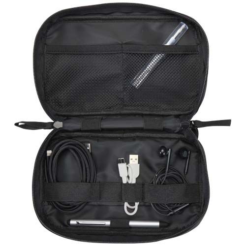 Fabriquée en cuir PU recyclé certifié GRS avec une doublure RPET assortie, cette pochette technique est conçue pour les voyageurs, les télétravailleurs et les passionnés de technologie. Compacte et facile à transporter dans un sac à dos ou un sac cabine, elle dispose d’un compartiment principal zippé dotées de fonctions d’organisation pratiques, notamment une boucle élastique pour stylo, deux poches en filet pour les écouteurs et les petits accessoires, un séparateur renforcé et plusieurs boucles élastiques pour maintenir en toute sécurité les câbles, les clés USB et les chargeurs. L’extérieur comprend une poche frontale avec fermeture auto-agrippante pour un accès rapide, ainsi qu’une sangle-poignée pour plus de commodité. Dotée d’un revêtement résistant à l'eau, elle protège vos objets essentiels où que vous alliez. Capacité : 1 litre. Matières : PU recyclé GRS Option d'impression par défaut : Transfert - Poche - couleurs max : 1 - 40 x 30 mm Pour ce produit, le fournisseur a rempli tout ou partie des données GPSR. Pour plus d'informations, veuillez-vous rapprocher du fournisseur.