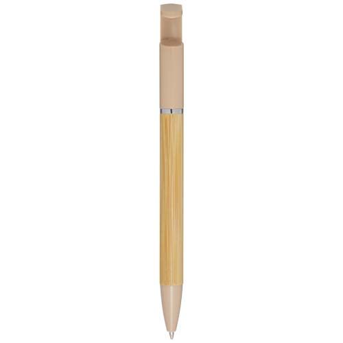 Stylo bille en bambou qui sert également de support pour téléphone. Le bouton et l'anneau central sont en plastique recyclé, la pointe est en laiton, et le corps est en bambou d'origine responsable. Couleur de l'encre : Noire. Longueur d'écriture : 1 000 mètres. Taille de la plume : 1 mm. Ce stylo est également disponible à l'encre bleue. Matières : Bambou certifié FSC Option d'impression par défaut : Gravure - Corps - couleurs max : 1 - 60 x 5 mm Pour ce produit, le fournisseur a rempli tout ou partie des données GPSR. Pour plus d'informations, veuillez-vous rapprocher du fournisseur.